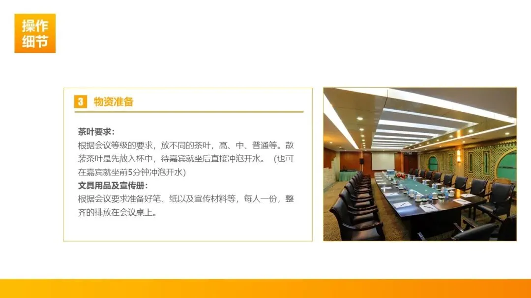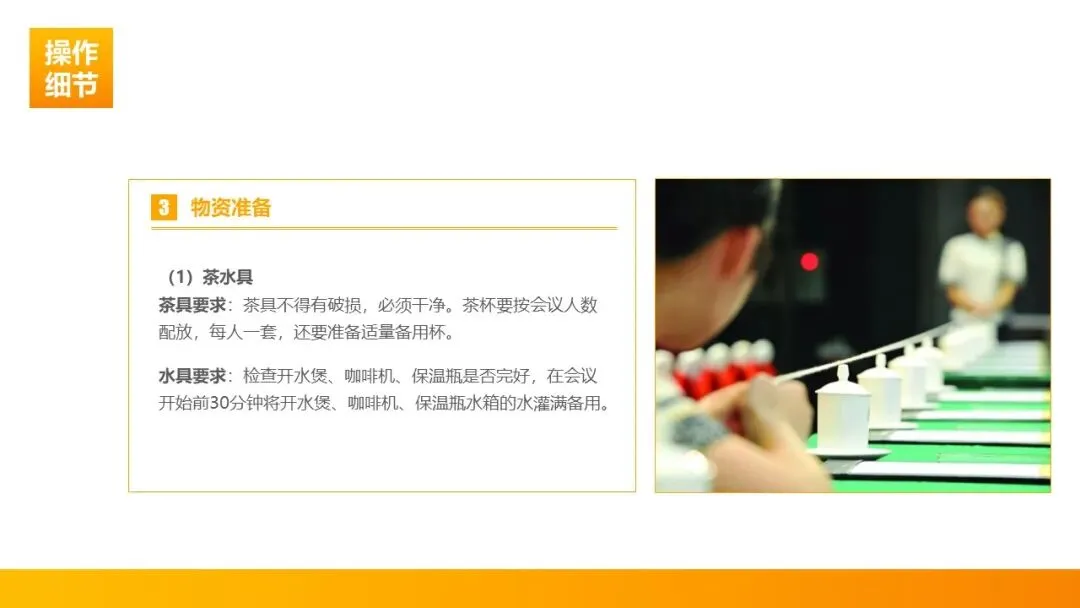 3. 细致备物,杜绝细节疏漏:茶具需完好无破损、洁净无污渍,按参会人数配齐并预留备用;开水煲、保温瓶提前灌满水,茶叶根据会议等级按需准备;笔、纸、宣传册等文具每人一份,整齐摆放于会议桌指定位置,以细节彰显专业。