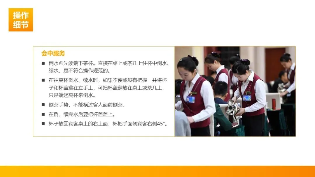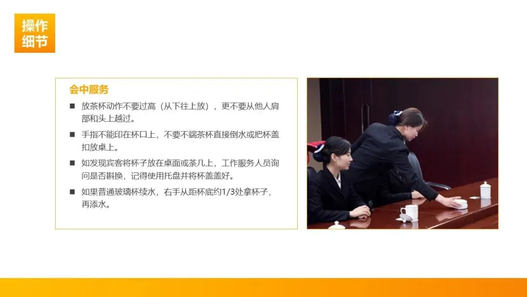 细节把控:发现茶杯污染、破损及时更换;续水时手指不触碰杯口,不用一只手上茶、忌用左手奉茶。