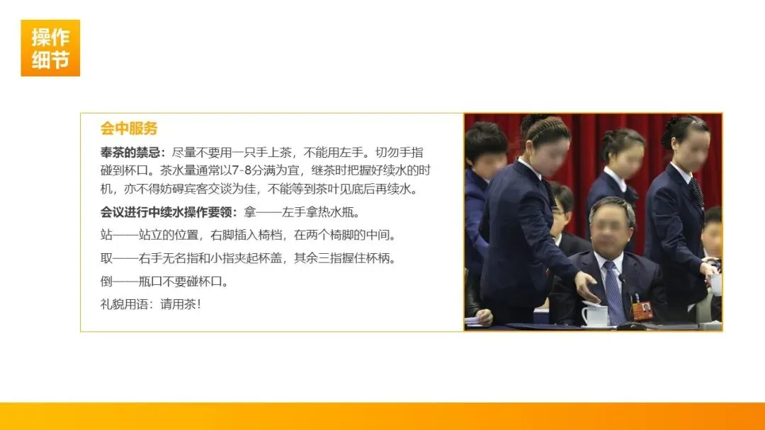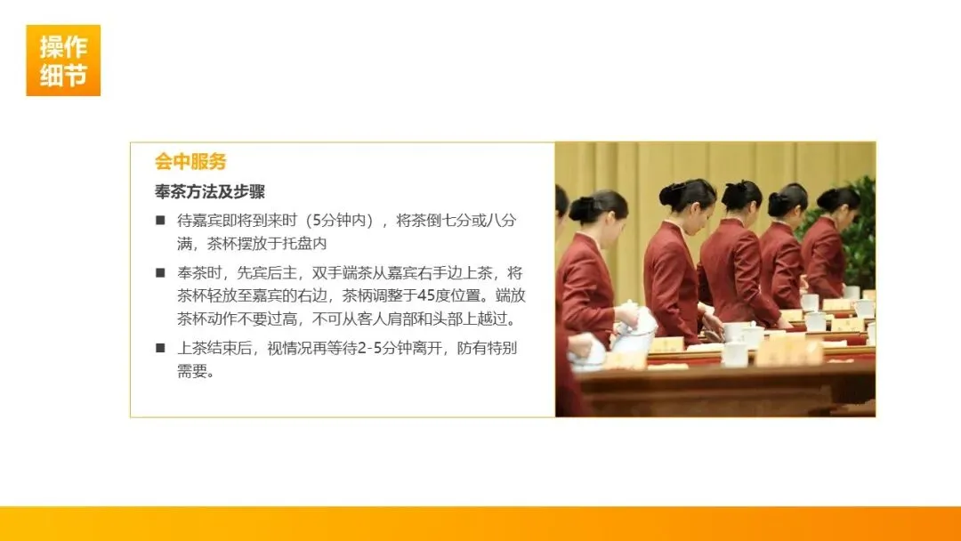奉茶要求:嘉宾到席前 5 分钟完成奉茶,茶水倒七分至八分满;双手端托盘从嘉宾右手边轻放茶杯,杯柄朝右侧 45°,动作忌过高、忌从宾客头顶或肩部越过。