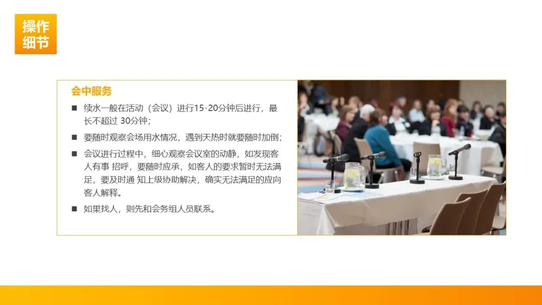 续水时机:会议开始 15-20 分钟后首次续水,最长不超过 30 分钟;天热时按需及时添加,嘉宾发言时可直接续水,全程轻手轻脚,不打扰交谈与会议进程。