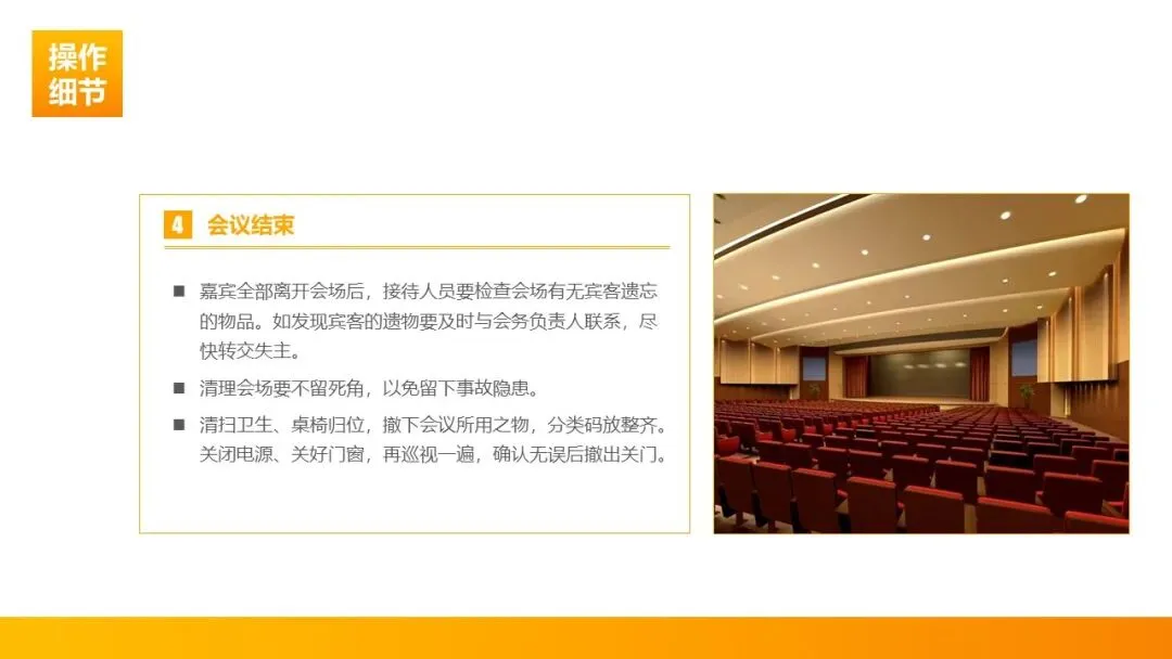 会议接待无小事,收尾环节是最后一道关口,唯有善始善终,才能让整个接待流程形成闭环,核心做好物品核查、会场清理、安全确认三大工作。