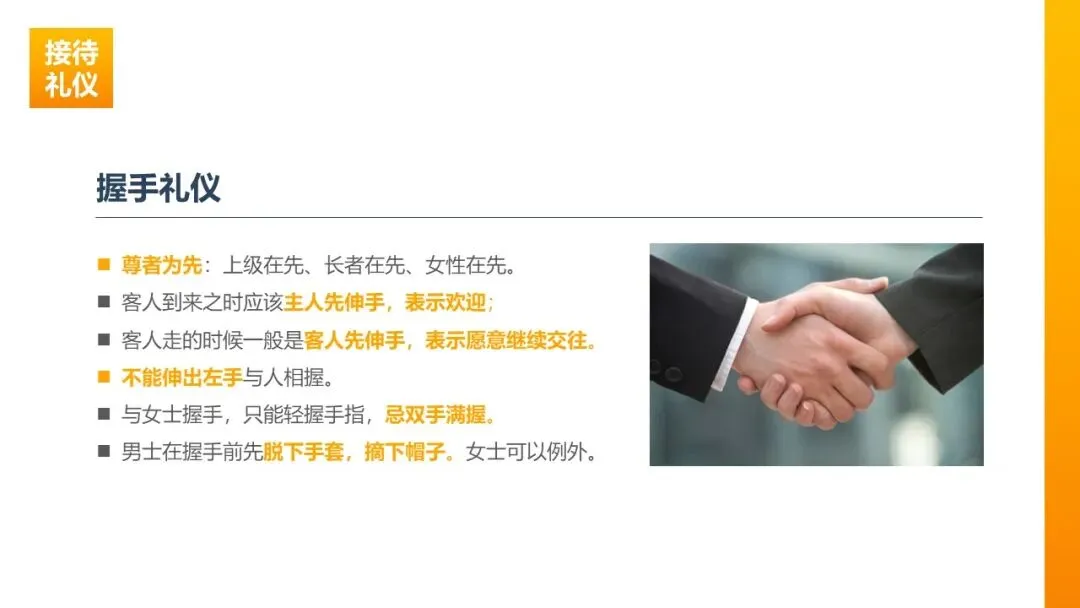 迎来送往、陪同出行等场景的礼仪规范,是会议接待的 “脸面”,一言一行皆为礼,一举一动皆见心,核心掌握握手、递名片、出行陪同三大核心礼仪。
