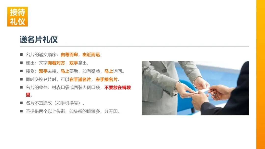 递交顺序:由尊而卑、由近而远;同时交换时,右手递、左手接。