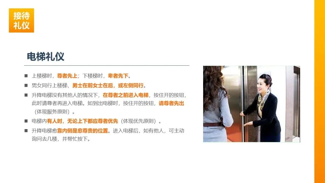 楼梯/电梯:上楼梯尊者先上、下楼梯卑者先下;升降电梯无人时,接待人员先入按住开门键请尊者进入,出电梯时按住开门键请尊者先出;电梯内有人时,无论上下均尊者优先,主动询问楼层并帮忙按键。