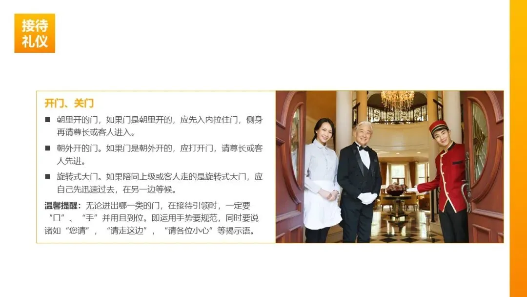 开门关门:朝里开的门,先入内拉住门再请尊长/客人进入;朝外开的门,先打开门请尊长/客人先行;旋转门则自己先通过,在另一侧等候。全程“口手并用”,辅以 “您请”、“请走这边”、“小心慢行” 等礼貌用语。