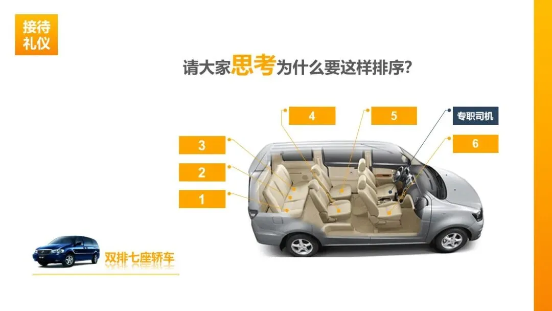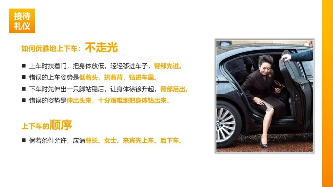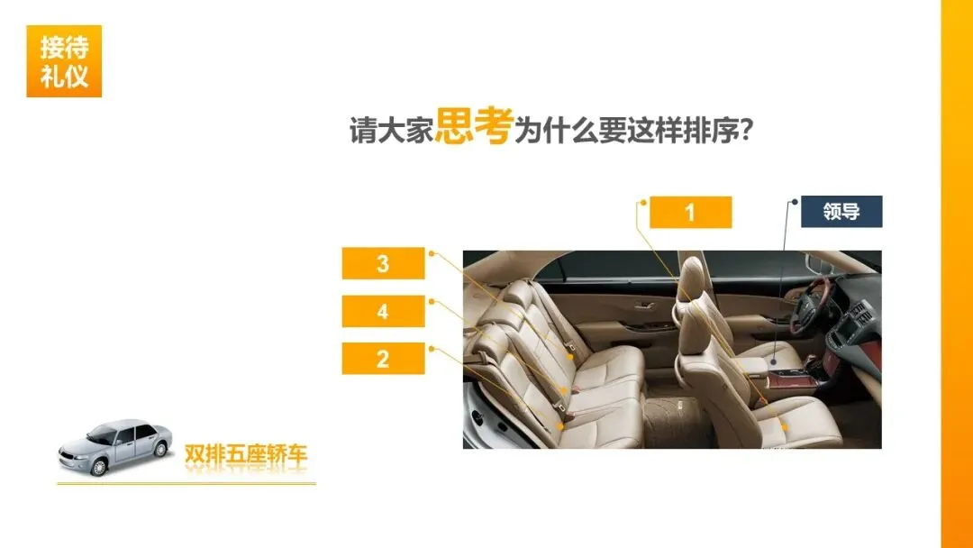 乘车礼仪:双排五座轿车,专职司机驾驶时主宾位为右后座,领导自驾时主宾位为副驾驶;上下车请尊长、女士先上后下,上车臀部先入、下车脚步先出,避免不雅姿势。