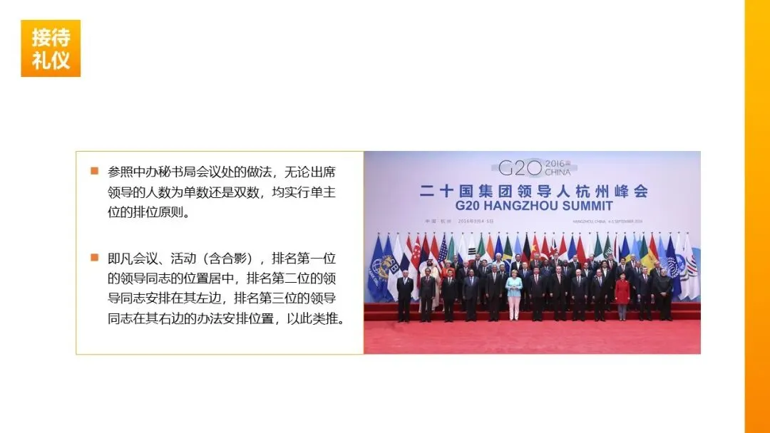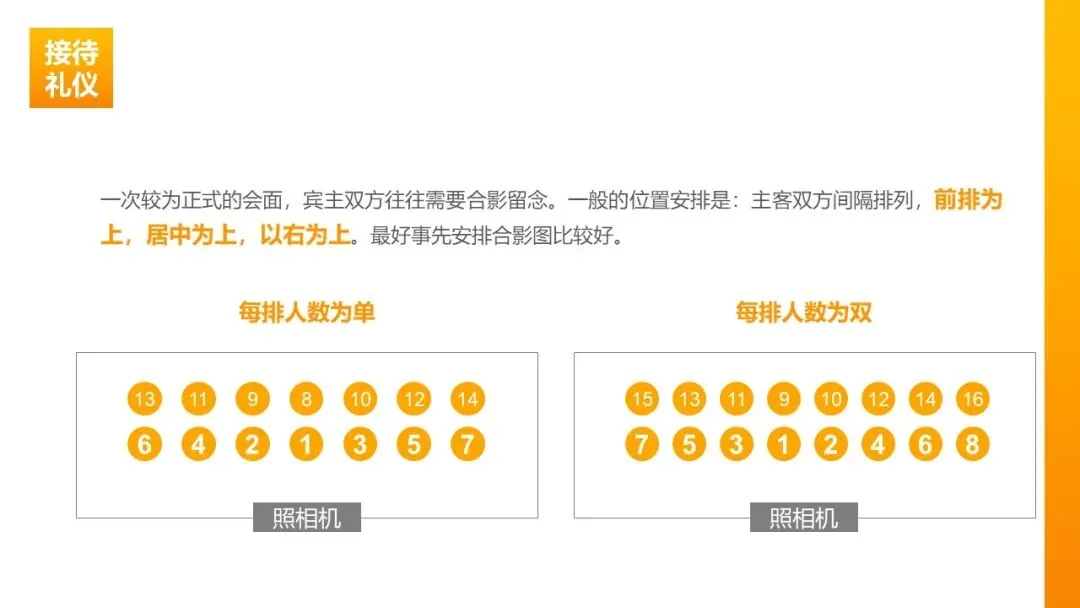 合影排位:宾主双方间隔排列,前排为上、居中为上;提前规划站位,避免现场混乱,确保次序合规。
