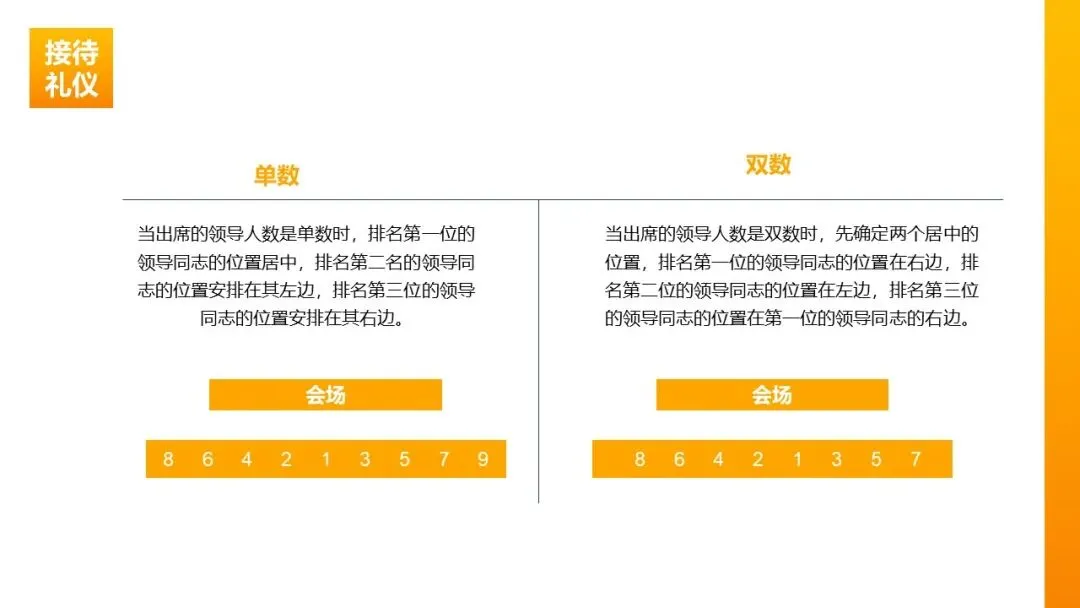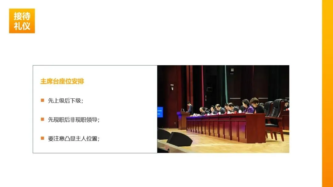 主席台排位:无论人数单双,均实行单主位原则;排名第一的领导居中,第二名在其左侧,第三名在其右侧,依次类推;先上级后下级、先现职后非现职,凸显主人位置。