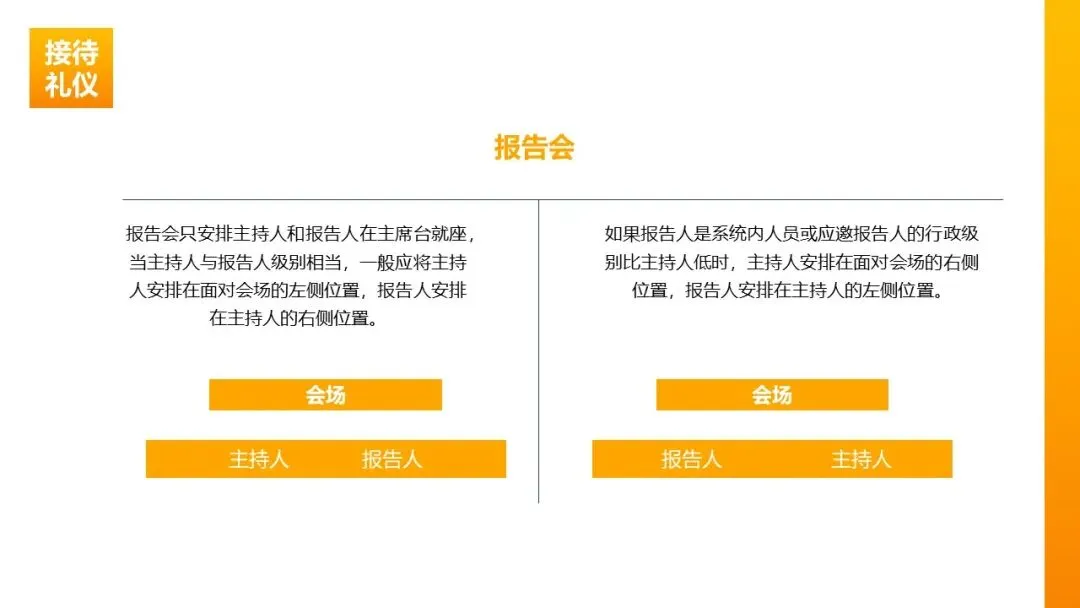 报告会排位:主持人与报告人级别相当时,主持人居左、报告人居右;报告人级别较低时,主持人居右、报告人居左。