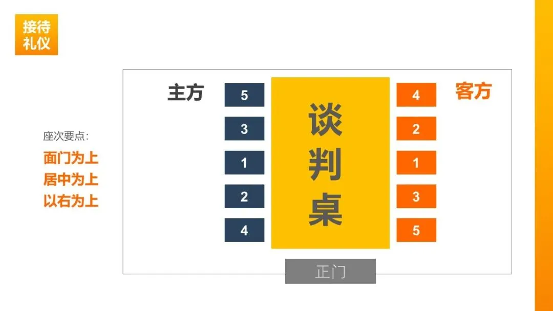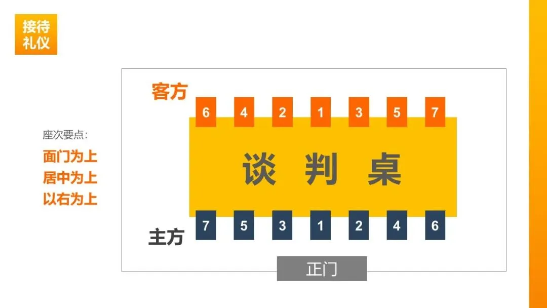 谈判桌排位:面门为尊,主方居左、客方居右;主位右侧为主宾位,若主宾身份高于主人,可将主宾安排在主位以示尊重。