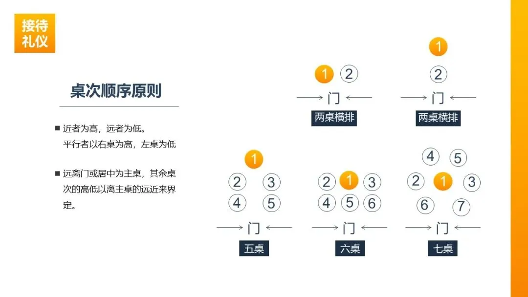 宴请桌次/座次:桌次以远离门口或居中为主桌,其余桌次按离主桌远近定高低,平行桌次以右为尊;每桌座次遵循主宾相对、以右为上原则,主位正对门口。