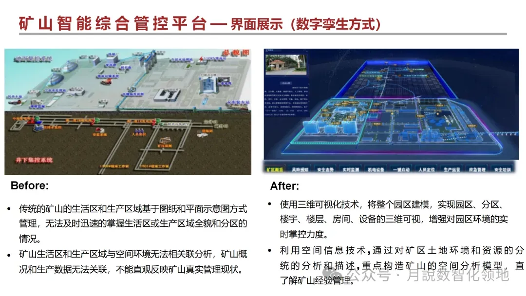 与传统矿山相比,智慧矿山的核心差异在于“自主决策”与“无人作业”——传统矿山依赖人工操作与经验判断,而智慧矿山通过数字孪生构建矿井虚拟镜像,实现地质环境、生产流程的可视化模拟,管理人员可远程操控设备、模拟灾害应急,甚至实现工作面无人化开采,从根本上改变了矿山的生产模式与管理逻辑。