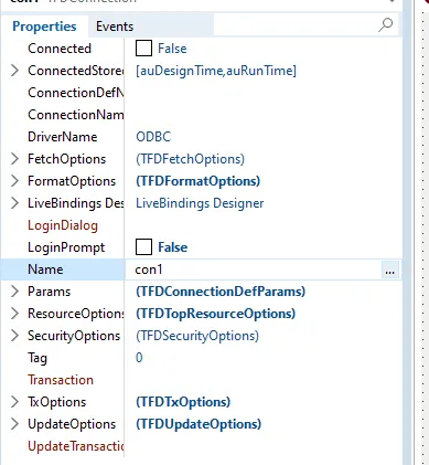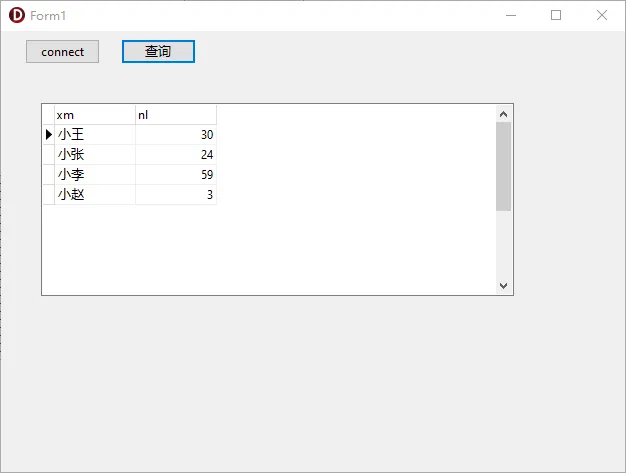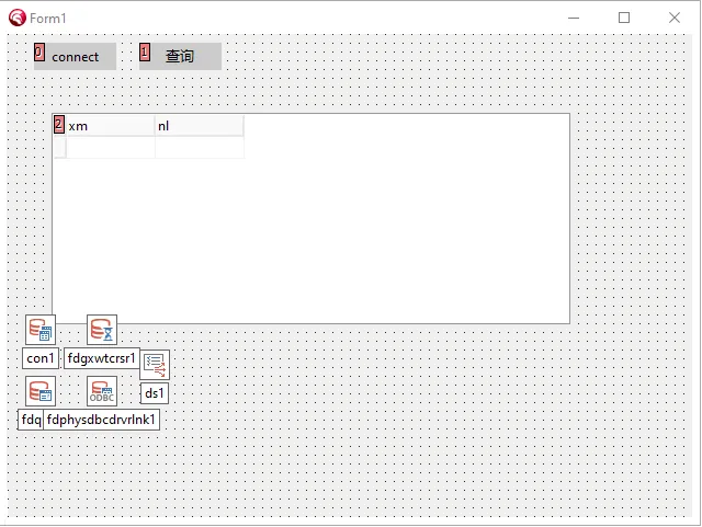 con1: TFDConnection; fdqry1: TFDQuery; fdgxwtcrsr1: TFDGUIxWaitCursor; fdphysdbcdrvrlnk1: TFDPhysODBCDriverLink; btn1: TButton; //链接按钮 btn2: TButton; //查询按钮 ds1: TDataSource; dbgrd1: TDBGrid;