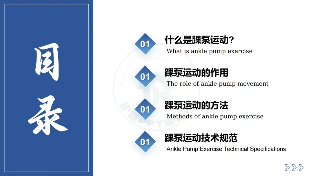 本次分享分为四部分:什么是踝泵运动、踝泵运动的作用、踝泵运动的方法、踝泵运动技术规范。