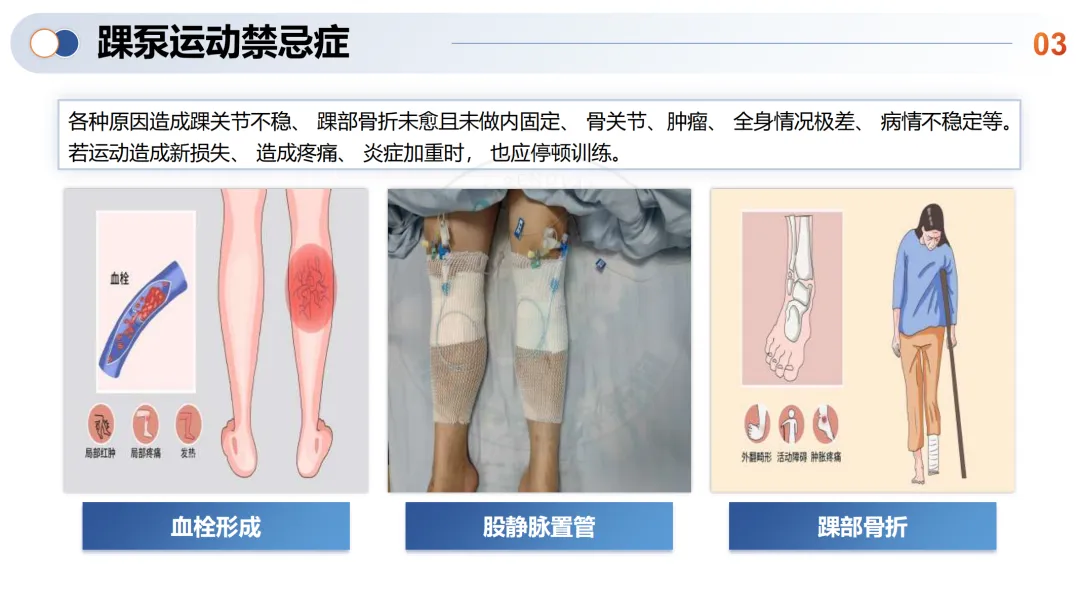 踝关节不稳、骨折未固定、血栓形成、股静脉置管等情况禁止📌进行踝泵运动。