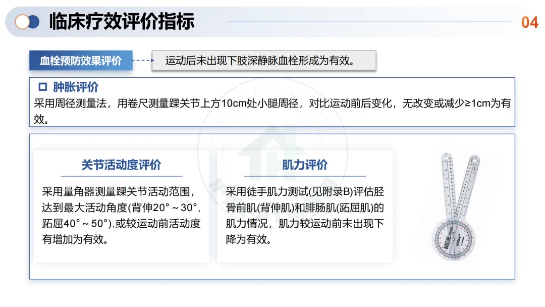 通过周径测量、关节活动度测量、肌力测试评价踝泵运动的临床效果。