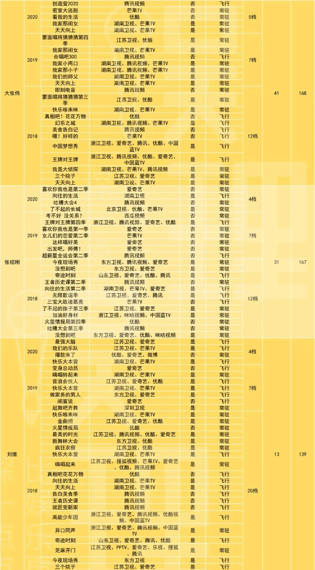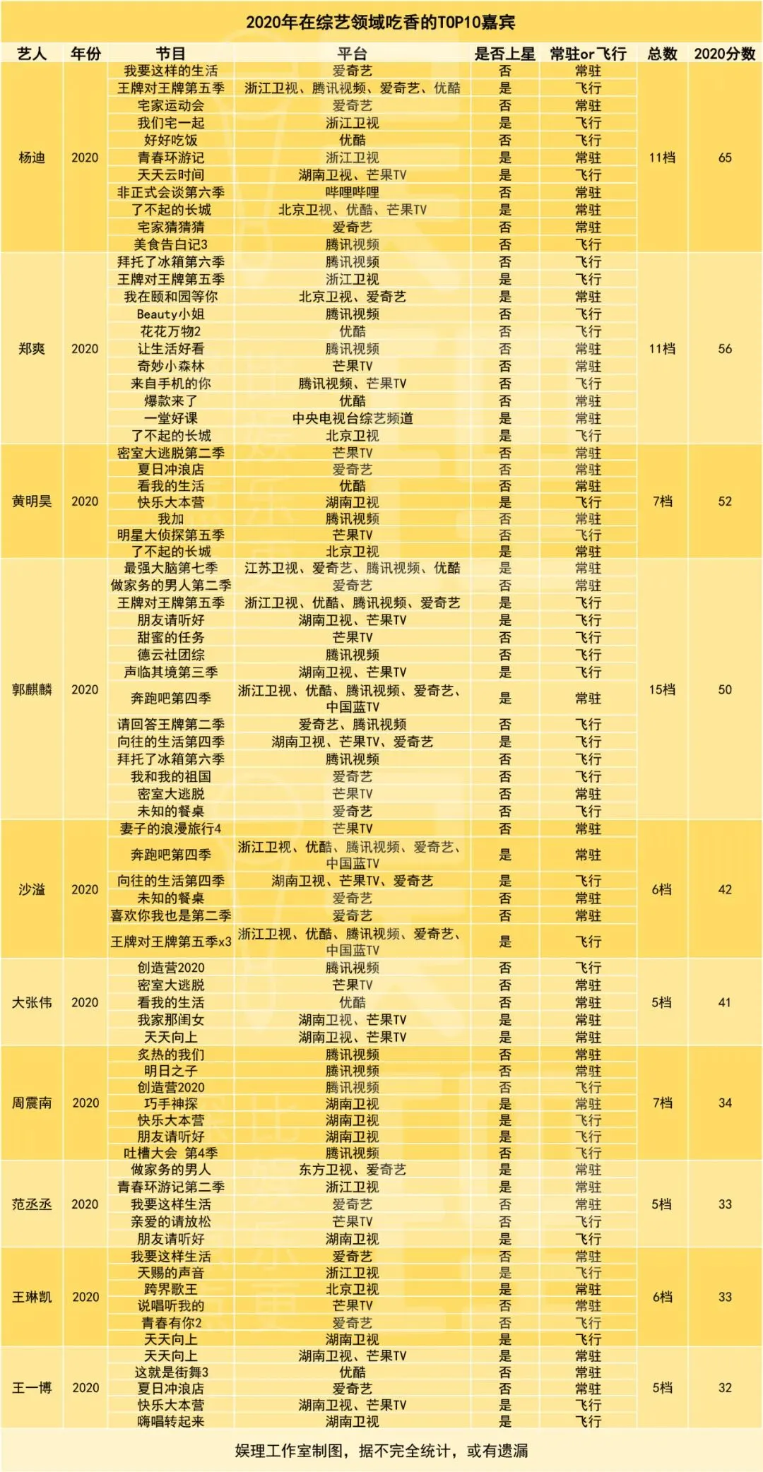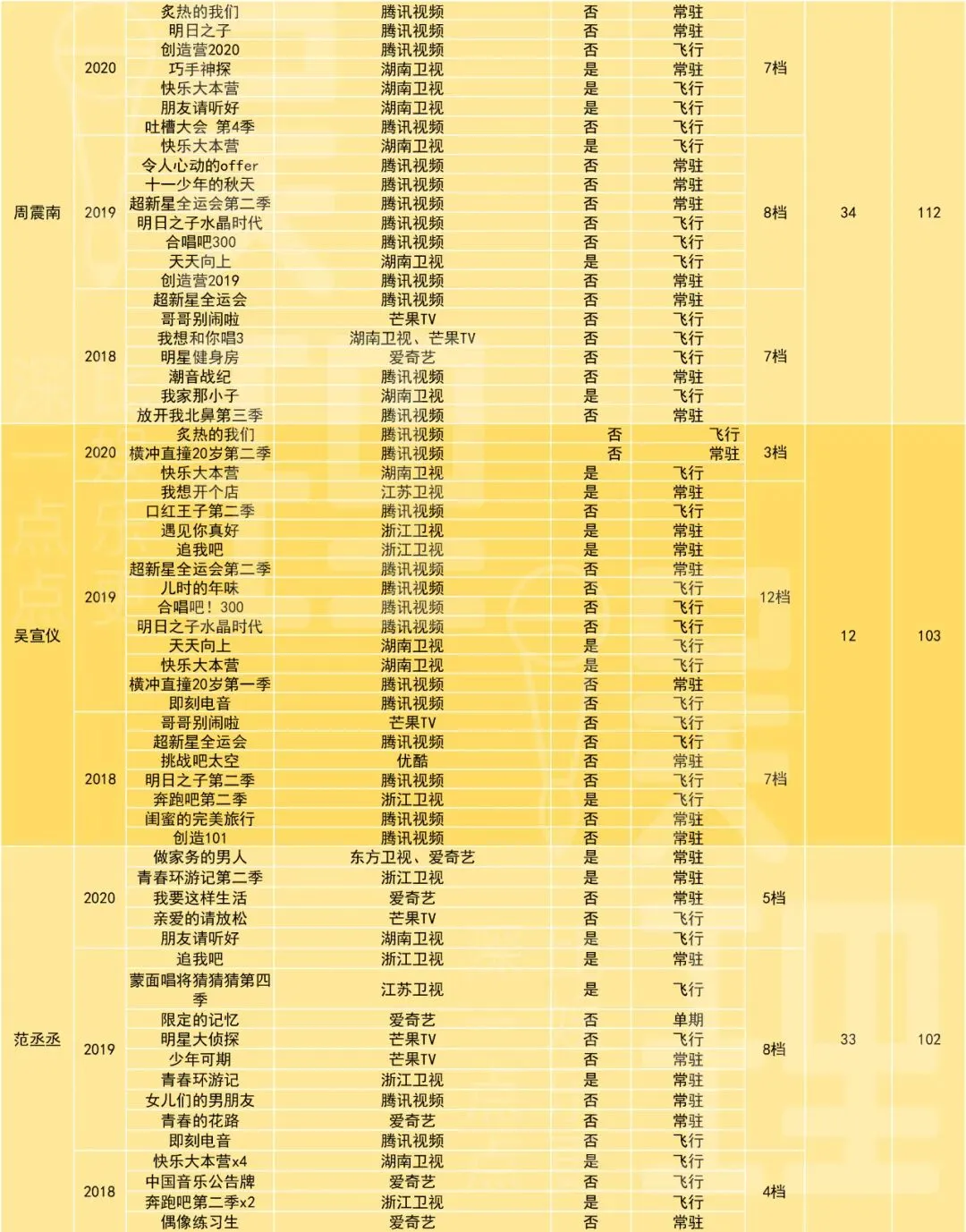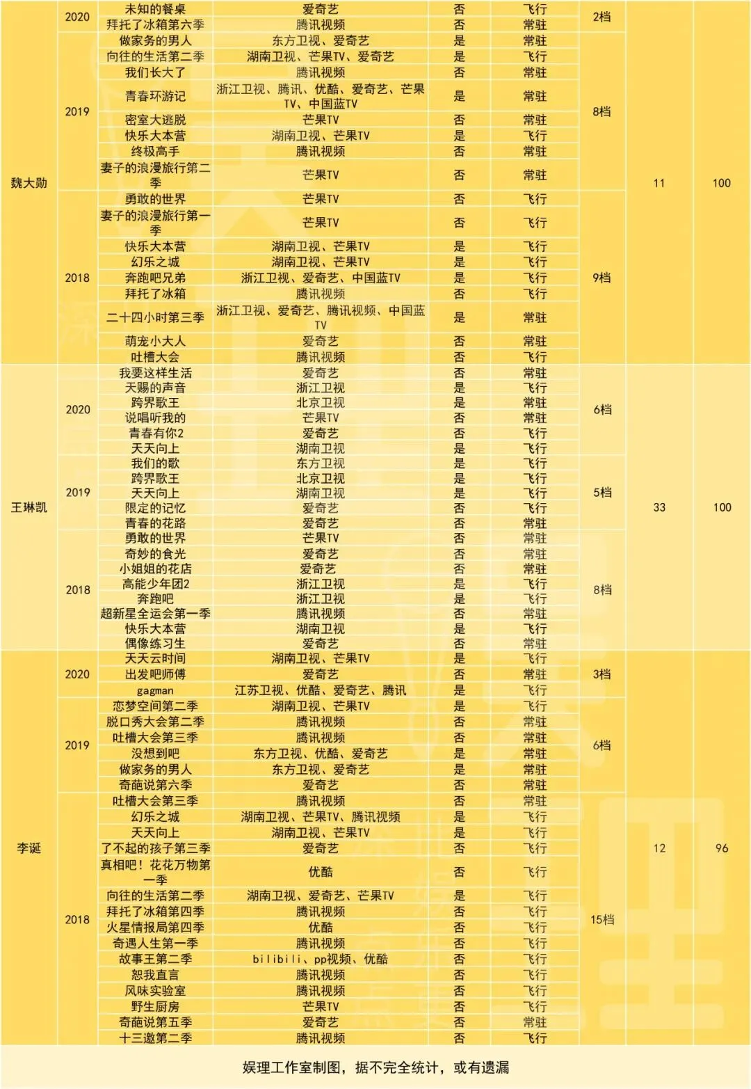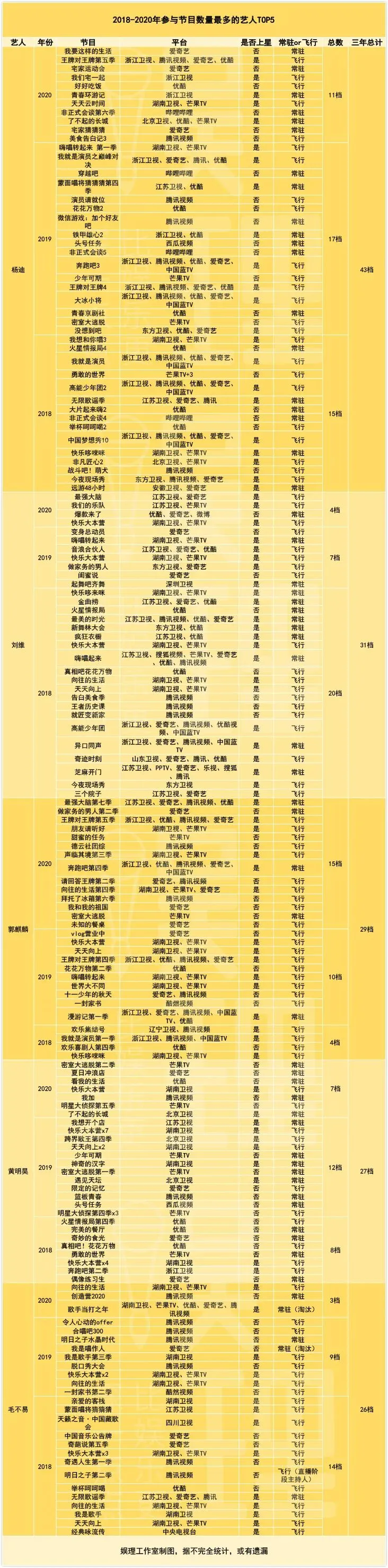 为了更清晰客观地研究近年国内综艺嘉宾的变化,娱理工作室列了一份表格。表格包含了2018年至今(2020年七月初),60位艺人上综艺的状况。