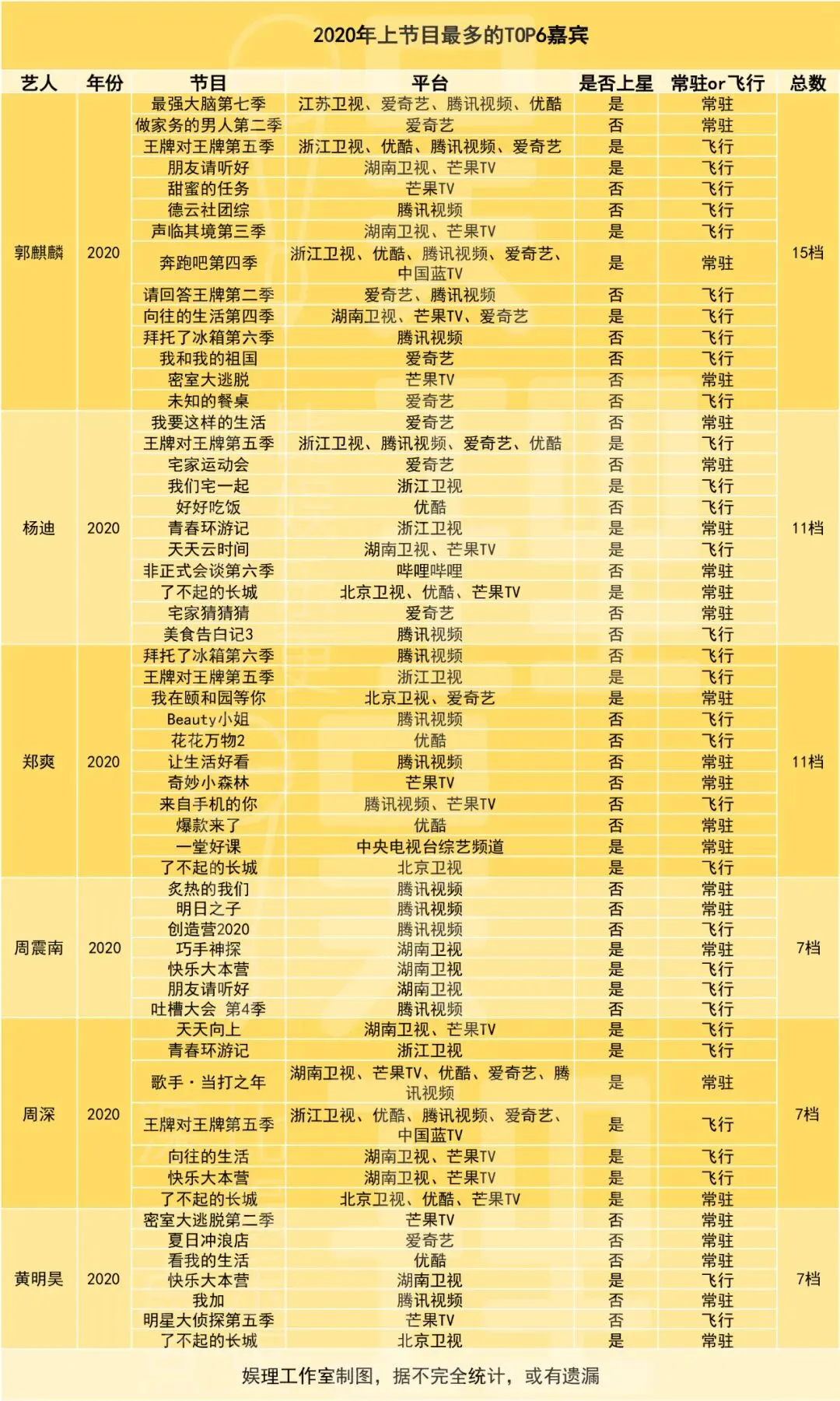今年以来,上节目最多的TOP6嘉宾则是郭麒麟(15档),杨迪(11档)、郑爽(11档)、周震南、周深、黄明昊(7档)。