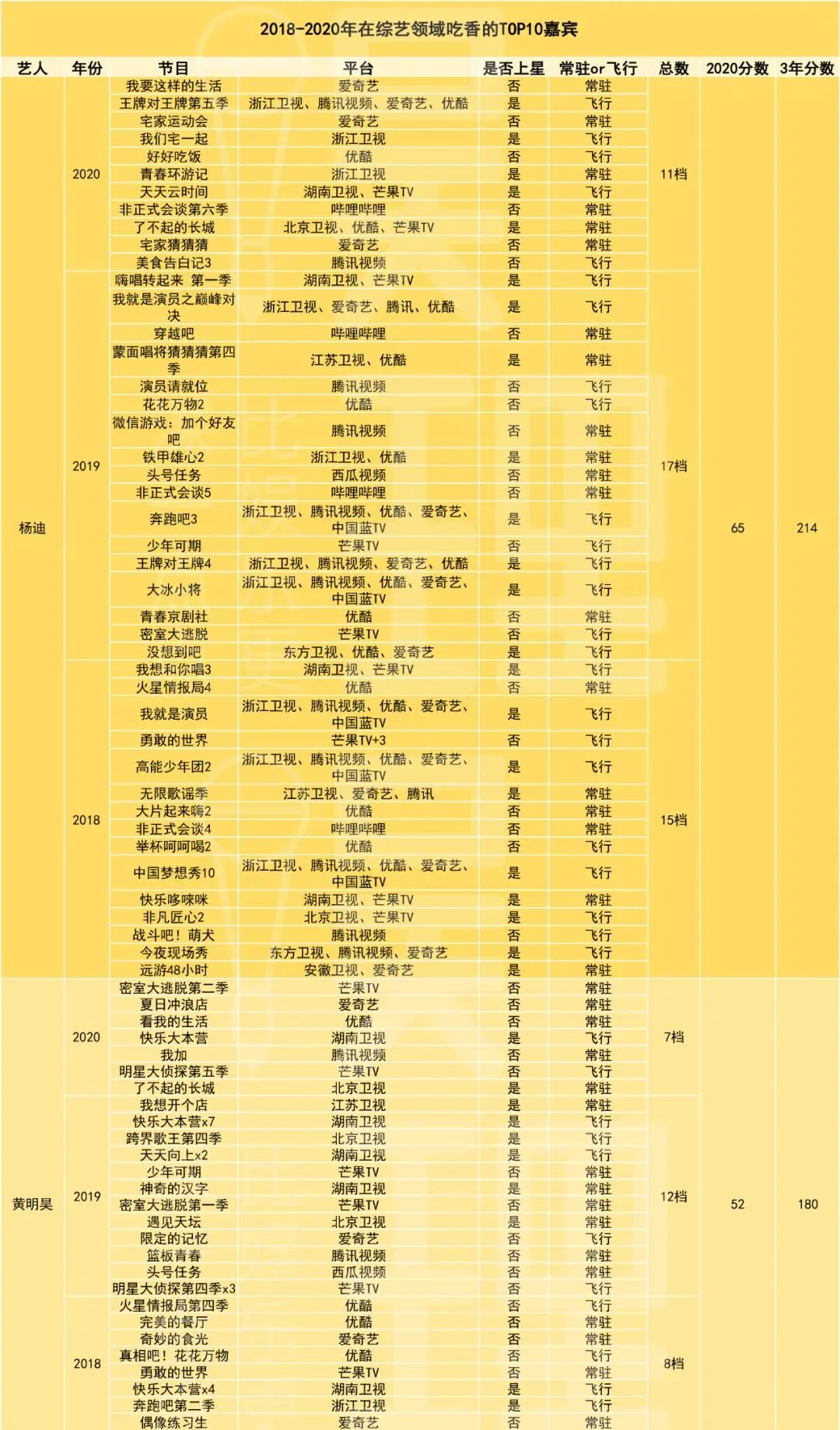 再细分析,如果获邀在某档节目担任常驻嘉宾,我们按“10分”计算(常驻10-12期不等),而担任飞行嘉宾计1分的话,那么近三年在综艺领域吃香的TOP10嘉宾分别是杨迪(214分)、黄明昊(180分)、大张伟(168分)、张绍刚(167分)、刘维(139分)、周震南(112分)、吴宣仪(103分)、范丞丞(102分)、魏大勋(100分)、王琳凯(100分)、李诞(96分)。