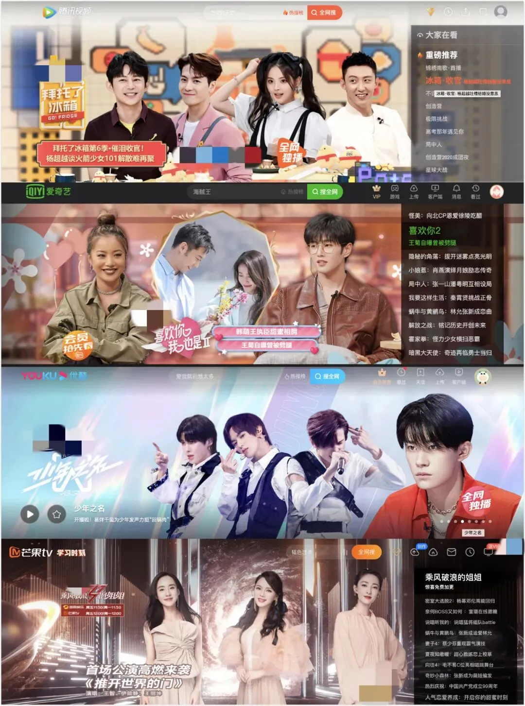 截止至发稿前的腾爱优芒四大平台首页Banner(综艺)