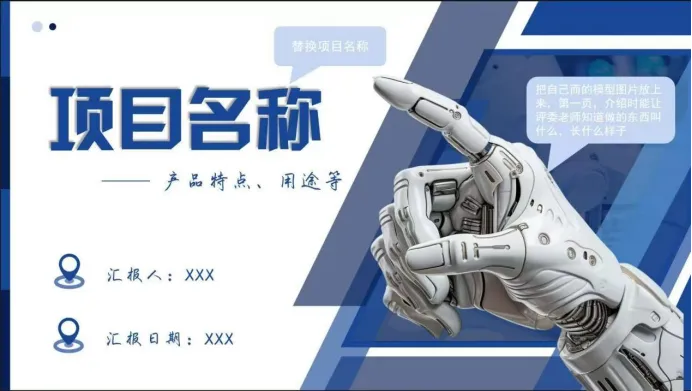 1. 整体展示:放置产品实物图或模型图,标注项目名称、核心用途,让评委快速知晓 “项目是什么”;