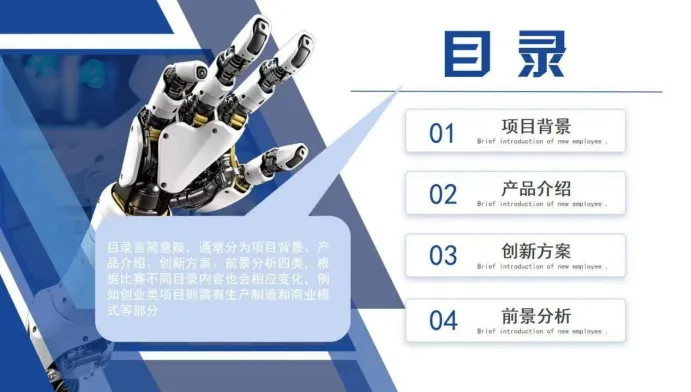参考优质项目 PPT 模板结构,结合小挑赛事要求,建议采用 “研究背景 - 产品介绍 - 创新方案 - 项目总结” 四大核心模块,按需补充商业落地相关内容,形成逻辑闭环: