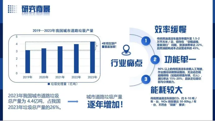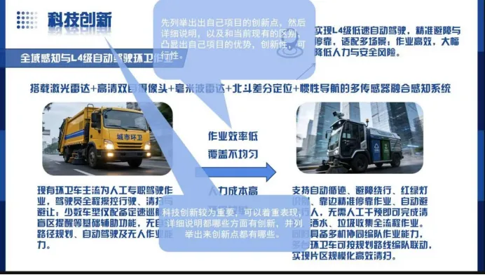 1. 行业痛点:以直观图表呈现赛道现存问题,如智能环卫车项目中 “传统环卫车效率低、能耗大、漏扫率高” 的核心痛点,用具体数据增强说服力;