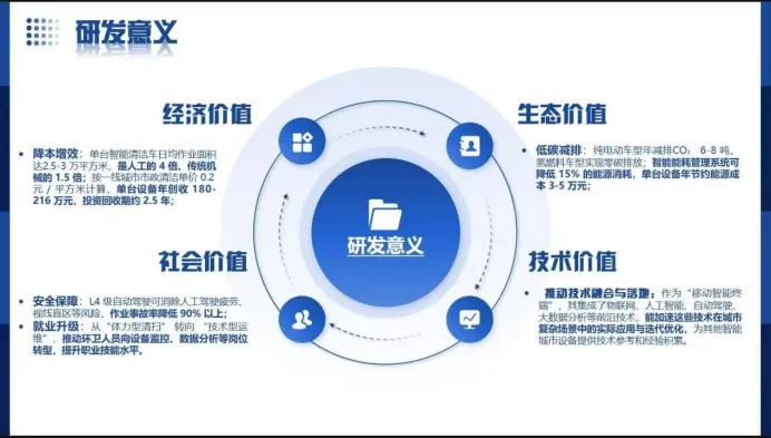 •核心要素:项目名称(简洁醒目,含核心关键词,如 “L4 级智能环卫车 —— 城市环卫无人化解决方案”)、产品模型图 / 实物图、汇报人、团队名称、汇报日期;