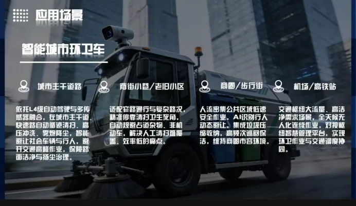 2. 部件拆解:拆分核心组件并说明功能,如智能环卫车的 “多传感器融合感知系统”“机械作业模块”,可搭配箭头标注与简短文字解释;