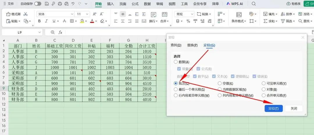 第一个常规用法,是定位批注。先勾选“批注”,点击“定位”。