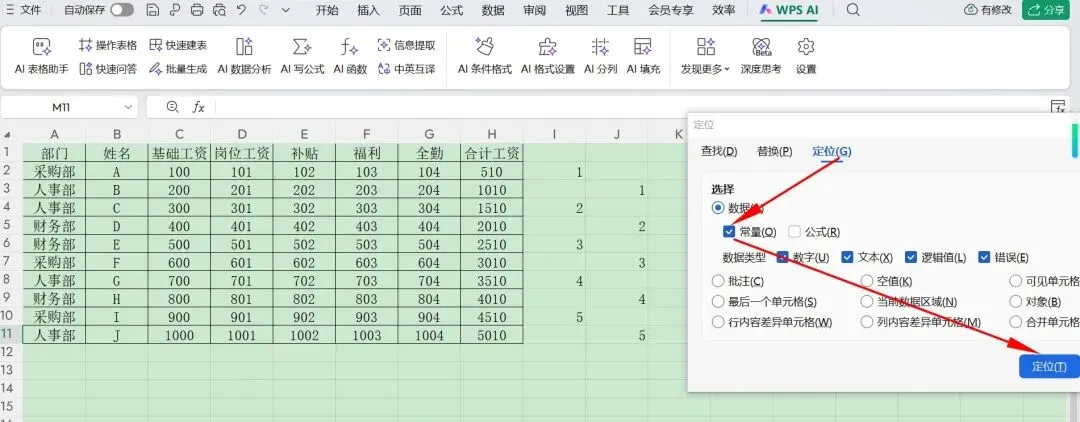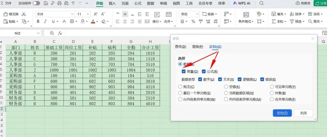 第二个常规用法,是定位常量和公式。也是一样的操作方法,直接在“定位”里勾选“常量”或者“公式”。
