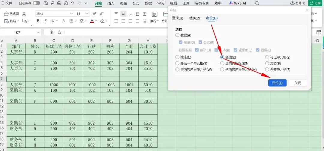 第三个常规用法,是定位空格。勾选“空值”,点击“定位”。