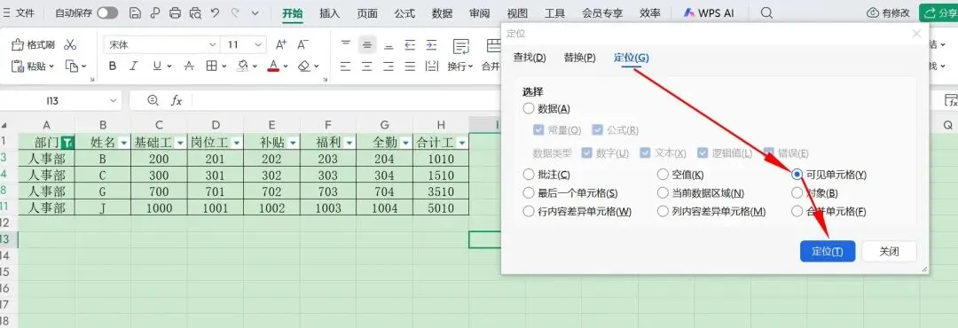 第四个常规用法,是不复制隐藏行。在筛选数据后,用“可见单元格”定位,避免把隐藏行也复制进去。比如下图所示,学习如何复制筛选后的人事部数据,首先在定位里勾选“可见单元格”,再点击“定位”。
