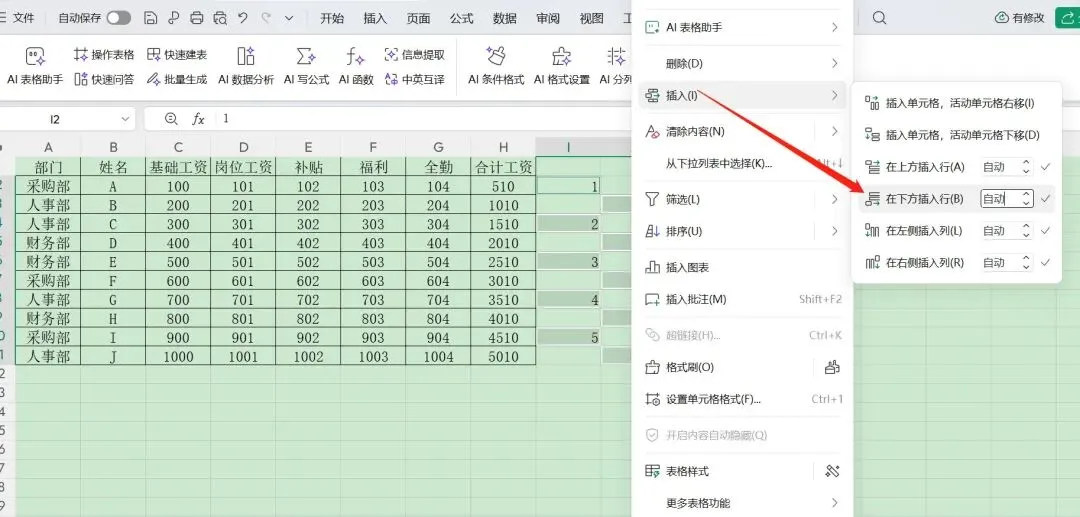 接下来,单击右键,选择“插入”,再选择“在下方插入行”。