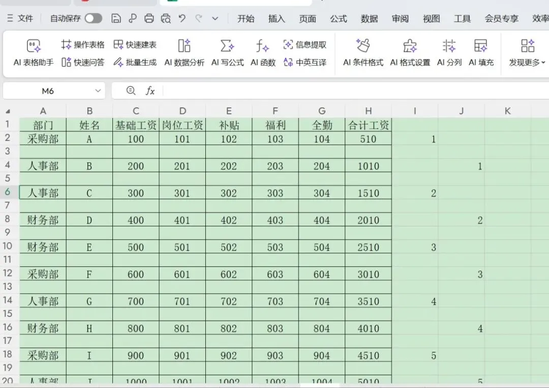第五个常规用法,是用定位进行隔行插入。首先加两列辅助列,如下图所未,在I2列输入1,再在J3列输入1,接着选中这两个数据下拉,然后选中I列和J列所有数据,再定位,勾选“常量”,点击“定位”。
