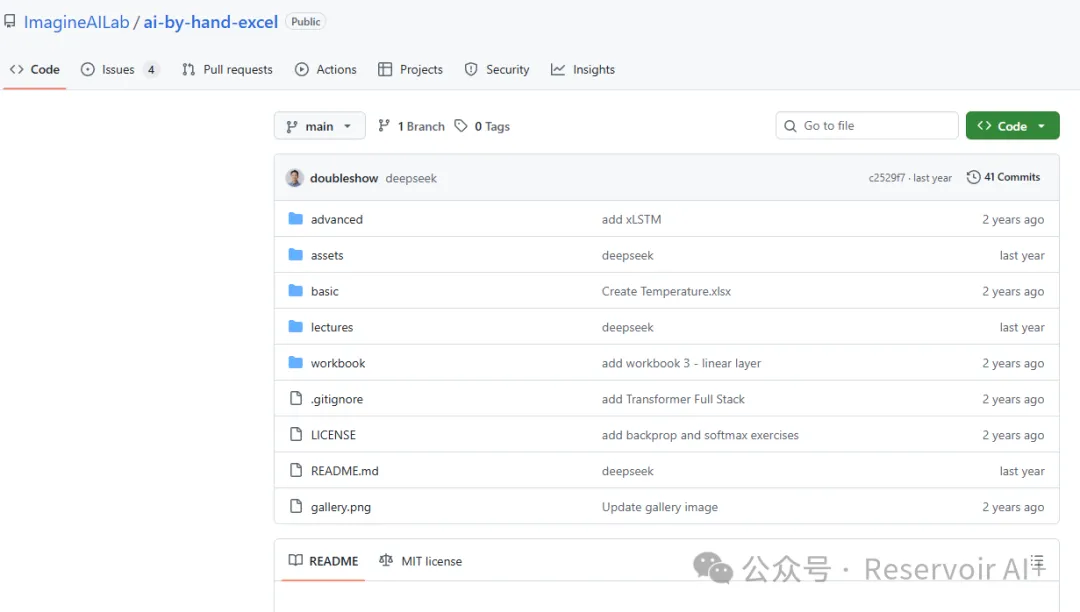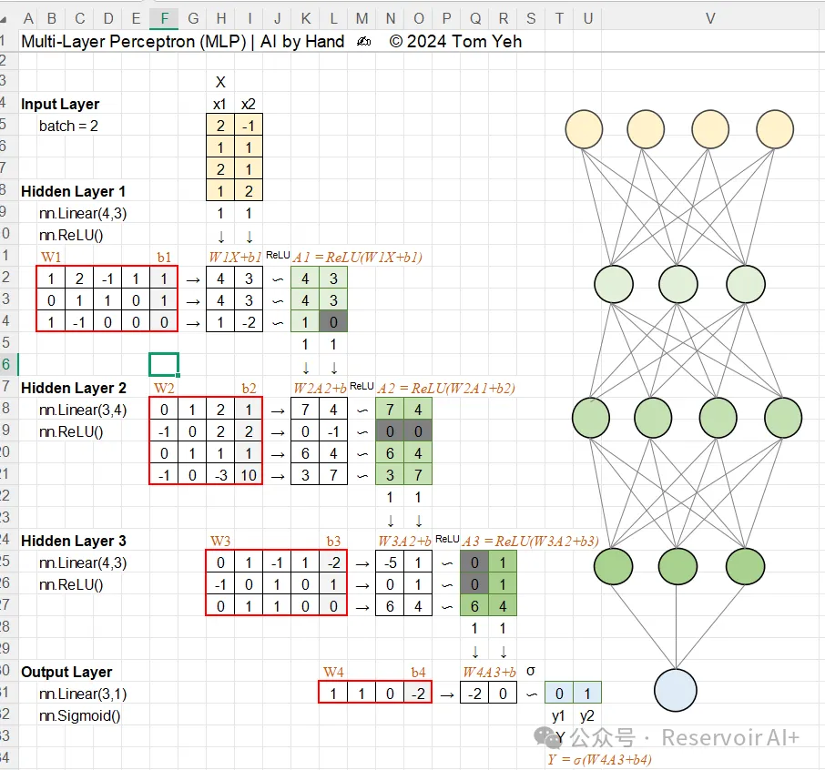 ✅ 项目地址:github.com/ImagineAILab(直接复制到浏览器,就能找到所有资源,完全开源免费)✅ 发起者:这个项目的核心发起者是Tom Yeh教授(科罗拉多大学博尔德分校计算机科学系教授),他发现当下AI论文层出不穷,里面的数学公式和复杂图表,哪怕是专业研究者都要花大量时间消化,更别说初学者了。于是他发起了“AI by Hand”系列,ai-by-hand-excel就是其中之一,目的就是用最直观的方式,降低AI学习的门槛,让每个人都能通过动手实践,理解AI的底层数学和逻辑。✅ 项目核心定位:教育型开源项目,不追求高效、不追求性能,只追求“直观”和“易懂”。它把复杂的深度学习算法,拆解成Excel里的一个个单元格、一个个公式,让我们通过手动操作、修改参数、观察结果,一步步理解算法的核心逻辑——没有复杂的代码封装,没有晦涩的理论堆砌,每一步计算都清晰可见。✅ 项目主要内容:里面包含了从基础到复杂的各类AI算法的Excel实现,不止有我们今天要重点说的全连接神经网络(MLP),还有Transformer、RNN、反向传播、矩阵乘法甚至ResNet等热门算法和模型的模板及教程。更惊喜的是,项目最新发布的内容竟然在拆解Deep Seek,还拆解了其中的多头注意力(类似DeepSeekMoE中的多头潜在注意力)和混合专家(MoE)这些复杂组件,不得不说大学教授就是厉害,原来万物皆可Excel啊。简单说,这个项目给我们提供了一系列免费的Excel模板和详细教程,我们可以直接下载使用,也可以修改参数、查看公式,甚至自己动手修改模板,真正做到“亲手搓AI”。而且项目还会通过Substack博客实时更新教程和练习,还有视频演示和互动反馈机制,遇到问题可以和作者交流。(可惜,视频观看受限制,文字版的可以阅读下,内容比Git更丰富,参考地址👇https://www.byhand.ai/t/spreadsheet)✦ 二、实操教学:用Excel手搓全连接神经网络(MLP)✦