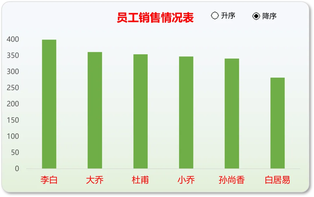 此时你会发现:只要原数据一改,图表自动重排,不用手动拖!四、进阶升级:加两个按钮,自由切换升降序