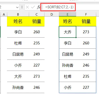 B 列 / C 列:类别名称(B列姓名,C列销量)二、核心一步:用 SORT 函数自动排序