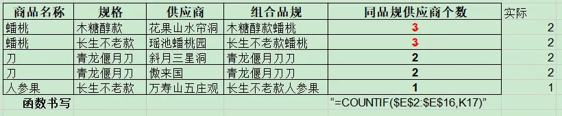 1.统计个数使用函数countif()(遗忘的话可以翻之前讲解),因为是需要同品规,就需要组合商品名称和规格字段=C2&B2