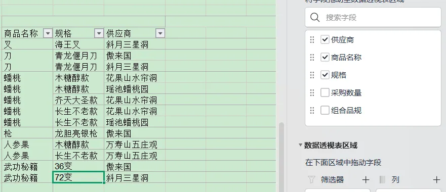 1.选择采购记录数据,点击插入数据透视表(遗忘的话可以翻之前讲解),勾选商品名称、规格和供应商字段,然后进行格式整理。