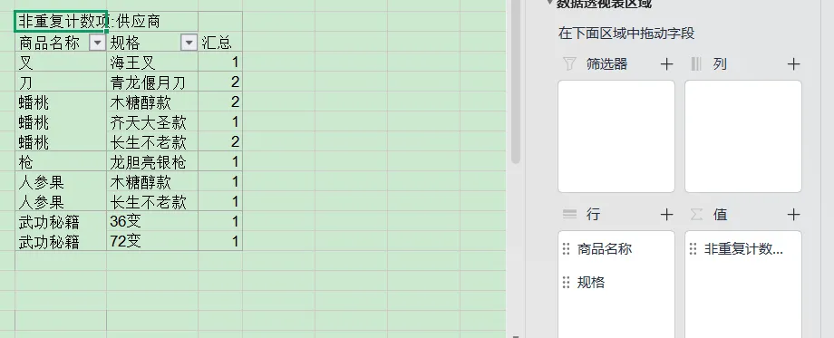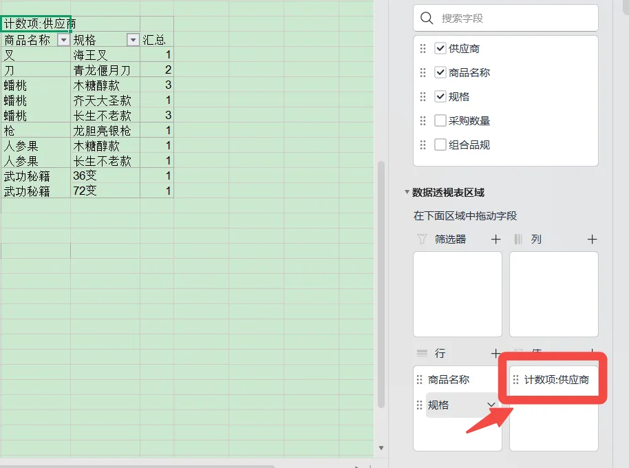 2.其实我们不需要展示供应商名称,只需要统计个数,于是将供应商字段从行拖拽到值。