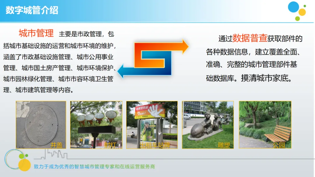 - 城市部件管理法:对井盖、路灯、雕塑等城市设施进行普查,建立完整数据库,给每个设施配 “身份证”;