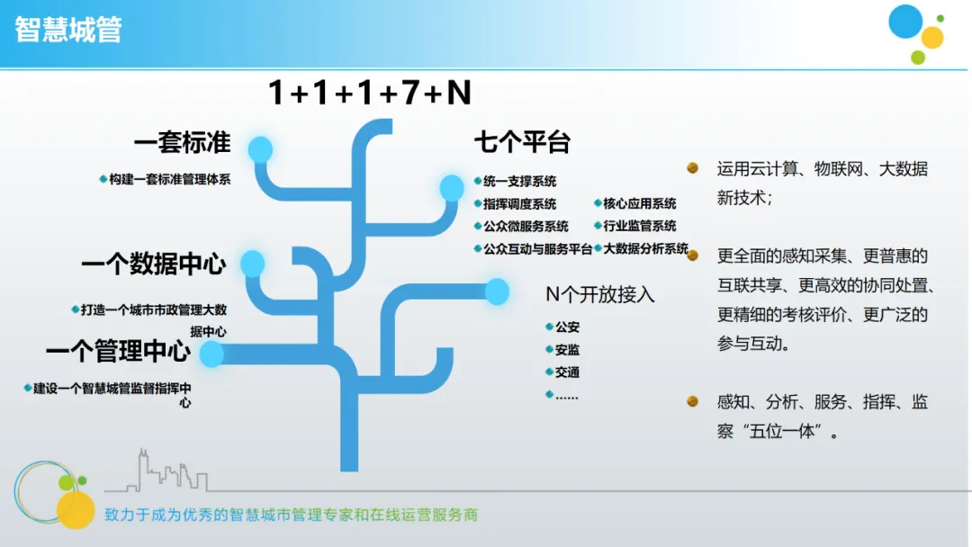 智慧城管不是对数字城管的否定,而是在其基础上的全面升级,核心是 “1+1+1+7+N” 架构: