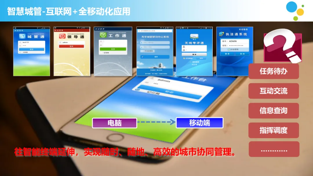 智慧城管将应用延伸到移动端,推出 “城管通”“领导通”“执法通” 等多款 APP,实现: