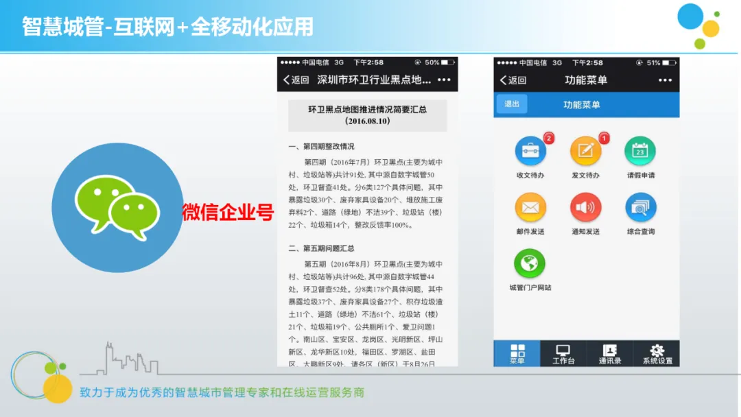 - 微信企业号:推送工作动态、整改情况,提高协同效率。
