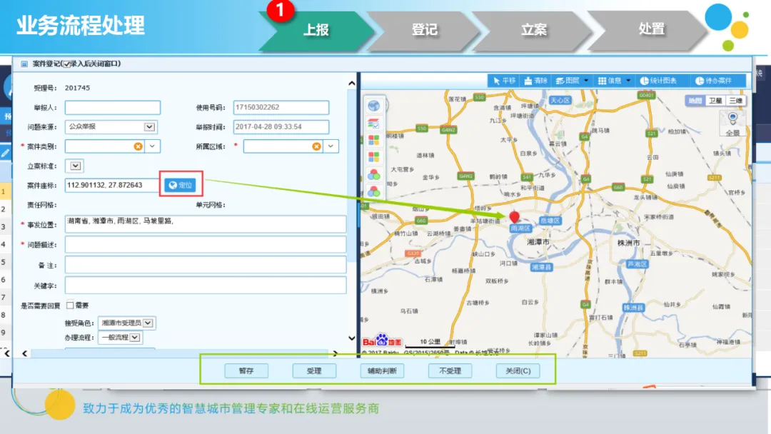 - 上报:采集员、公众通过 APP、热线、微信等渠道上报问题,附带照片、定位;
