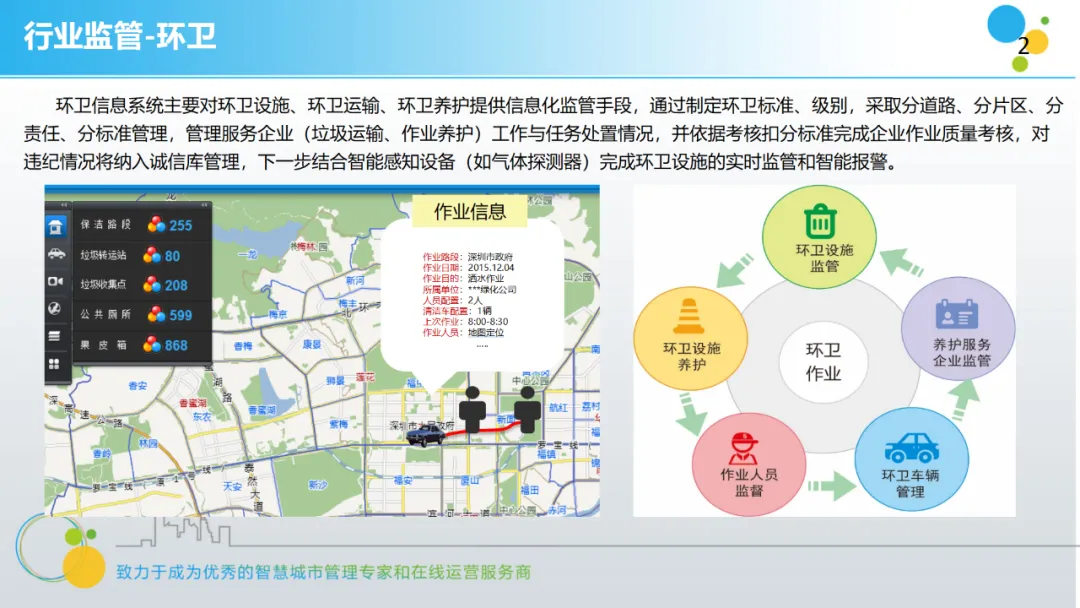 - 环卫监管:制定作业标准,对保洁路段、垃圾转运站、作业车辆进行实时监控,依据考核标准对作业质量打分,违纪情况纳入诚信库;