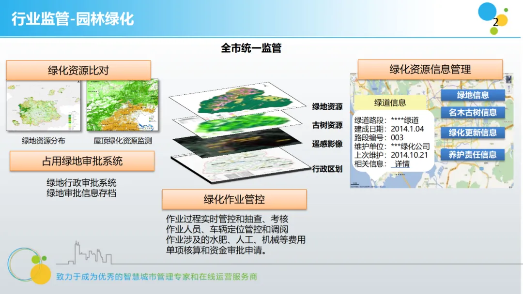 - 园林绿化监管:建立绿地、古树名木数据库,通过遥感影像监测绿地变化,对养护作业进行实时管控和抽查;