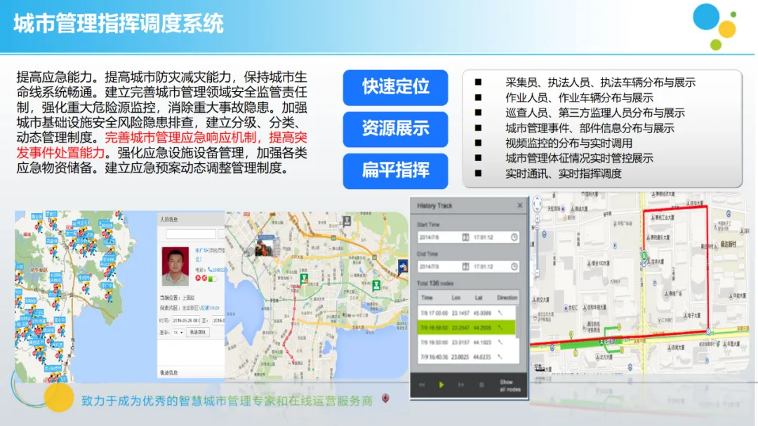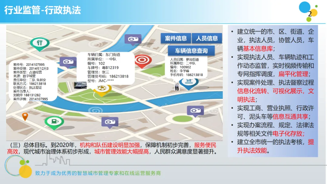 - 行政执法监管:建立执法人员、车辆信息库,实现执法轨迹、案件处理的信息化流转,支持实时视频传输和专网指挥调度;