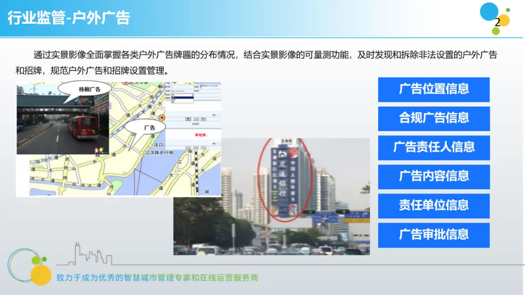 - 户外广告监管:通过实景影像掌握广告牌分布,结合可量测功能,及时发现和拆除非法广告;